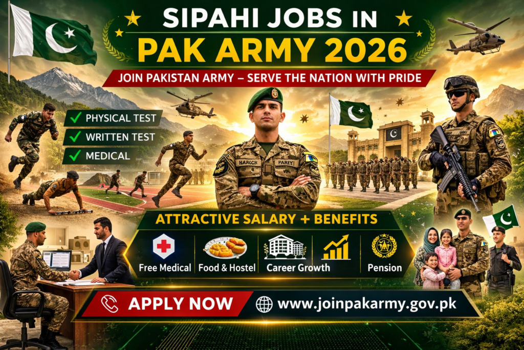 Sipahi Jobs in Pak Army 2026 are officially announced for passionate, energetic, and patriotic candidates who want to serve the nation with pride and honor. If you are dreaming of wearing the respected uniform of the Pakistan Army and building a secure and prestigious career, this is the golden opportunity for you. The Pakistan Army has opened recruitment for Sipahi (Soldier) positions across multiple cities of Pakistan including Punjab, Sindh, KPK, Balochistan, AJK, and Gilgit Baltistan. Candidates having Matric qualification can apply for these vacancies. The recruitment process includes online registration, physical test, written test, medical examination, and final interview. This opportunity is ideal for young individuals who are physically fit, mentally strong, and determined to serve Pakistan.